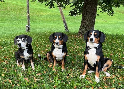 Das sind unsere drei reinrassigen Entlebucher Sennenhunde. Leika, Dina und Felice sind 3 Generationen. Sie gehören zu unserer Familie und bereiten uns sehr viel Freude.